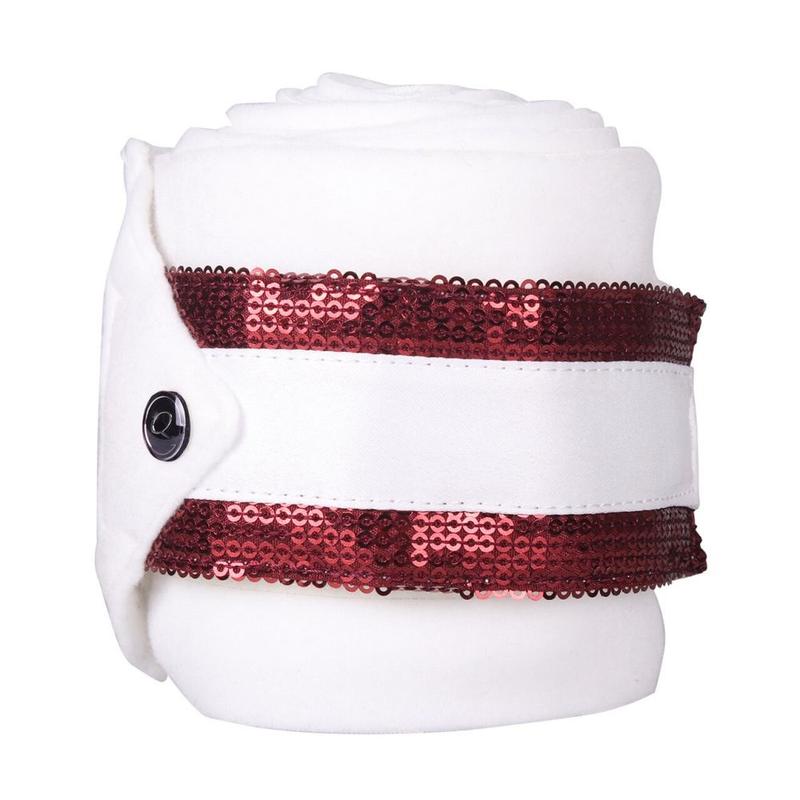 Bandaże polarowe firmy Equestrian Queen. Ozdobione rzędem kryształków.Wykonane z wysokogatunkowego polaru. Zapinane na rzepy. W komplecie 4 sztuki.Uwaga! Zdjęcie poglądowe, kolor burgundowy.