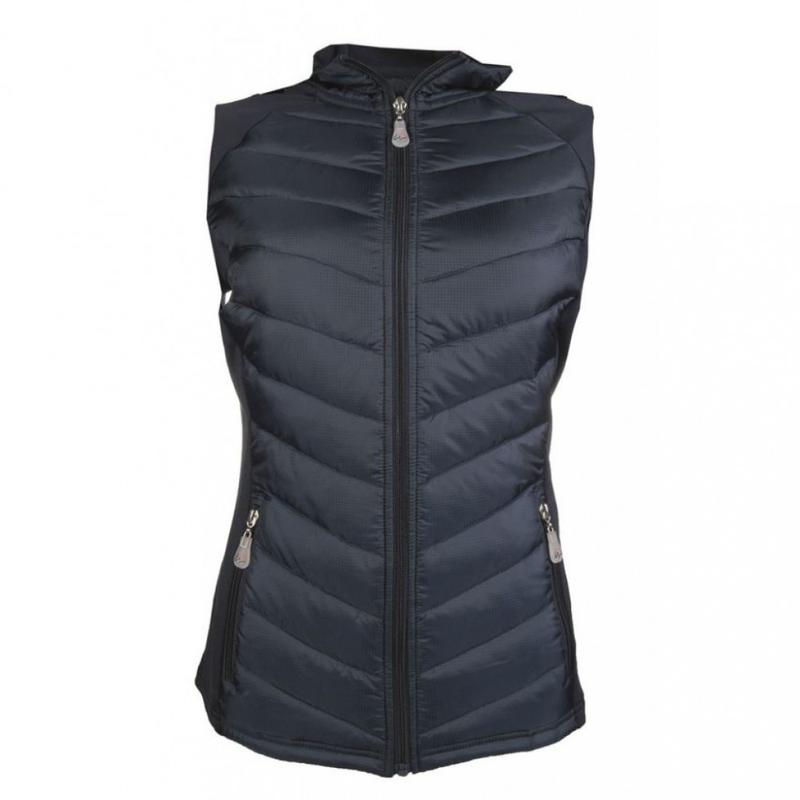 Bezrękawnik firmy HKM. Posiada lekkie ocieplonie na przódzie i tyle, a boki wykonane ma z elastycznego materiału. Taliowany krój idealnie podkreśla figurę. Wyposażony w zamek błyskawiczny, dwie kieszonki po bokach zapinane na zamek oraz podwyższony krój kołnierzyka.