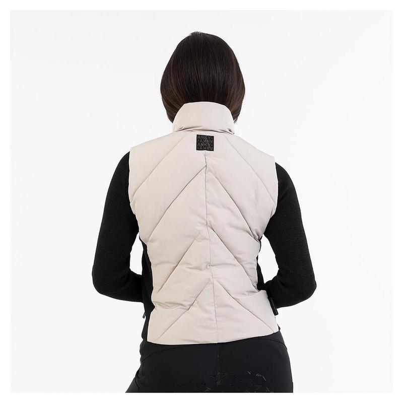Bezrękawnik damski firmy Anky. Wiatro i wodoodporny, oddychający materiał. Bufiasty, krótki, schodkowy styl. Dopasowana część boczna z czarnego materiału w drobne prążki. Wyściółka z syntetycznego puchu imitującego Soronę. Wodoodporny zamek błyskawiczny z przodu i zakryte kieszenie zapinane na zamek. Osłona podbródka i łapacz wiatru.