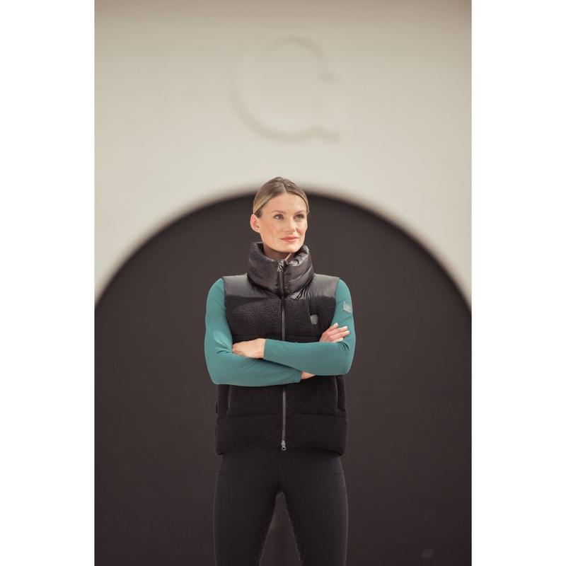 Bezrękawnik firmy Pikeur z kolekcji jesień-zima 2024/2025. Wykonana z pikowanego materiału ze stałym kapturem, lekko błyszcząca satynowa tkanina. Dwukierunkowy zamek błyskawiczny o wyglądzie metalu. Wysoki komfort noszenia dzięki wewnętrznej gumie na dole i pod pachami. Nadruk Pikeur na piersi i na krawędzi kaptura. Skład: 100% poliester