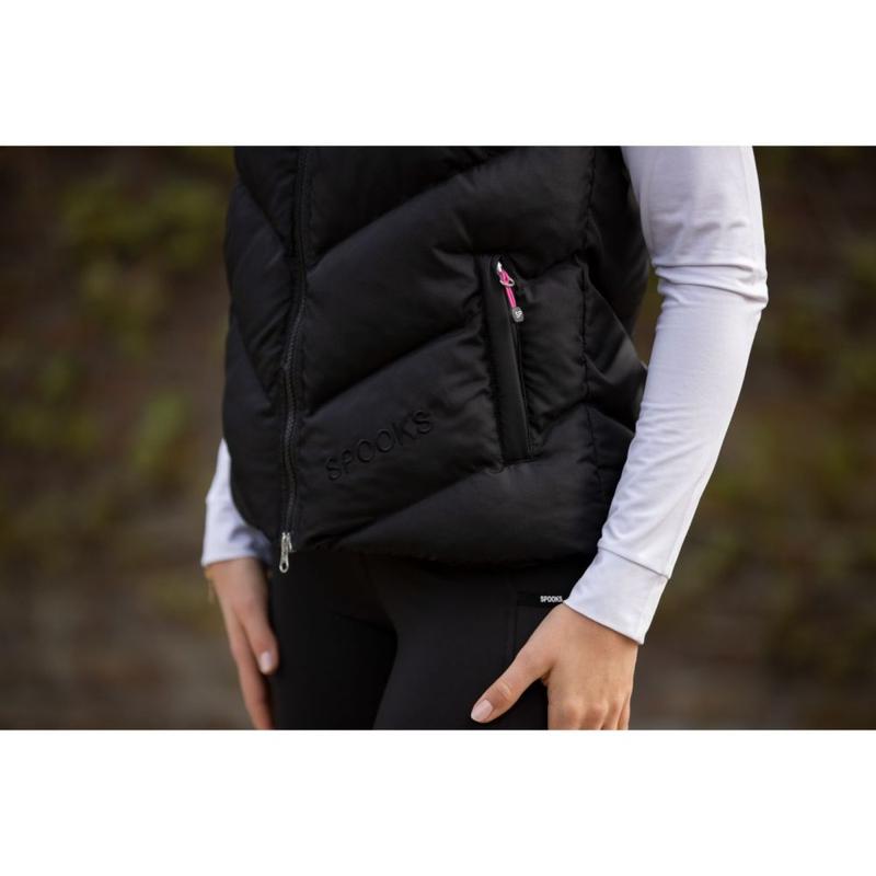 Bezrękawnik firmy Spooks. Posiada podszewke z wysokiej jakości sztucznego puchu, dzięki czemu zapewnia doskonałe ciepło. Bardzo duży kaptur można łatwo naciągnąć na kask, aby chronić się w zimnych i mokrych warunkach. Zapinane na zamek kieszenie boczne oferują miejsce na najważniejsze drobne przedmioty. Boczne kieszenie wyłożone są przytulnym polarem, dzięki czemu możesz ogrzać dłonie w chłodne dni. Bezrękawnik posiada minimalistyczny design z lamówką SPOOKS na kapturze i napisem SPOOKS na dole.