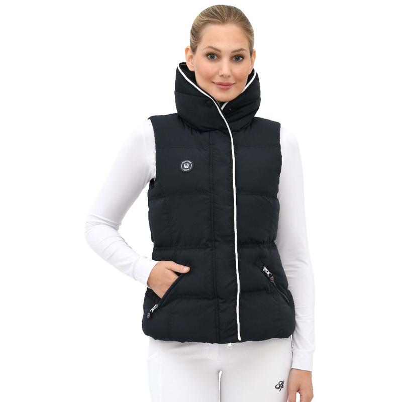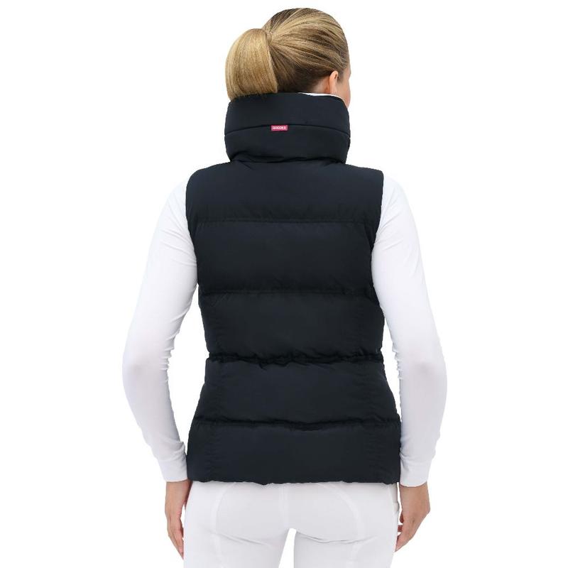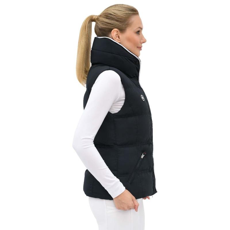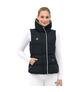 Bezrękawnik firmy Pikeur z kolekcji jesień-zima 2024/2025. Wykonana z pikowanego materiału ze stałym kapturem, lekko błyszcząca satynowa tkanina. Dwukierunkowy zamek błyskawiczny o wyglądzie metalu. Wysoki komfort noszenia dzięki wewnętrznej gumie na dole i pod pachami. Nadruk Pikeur na piersi i na krawędzi kaptura. Skład: 100% poliester