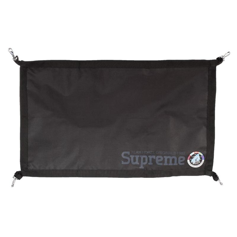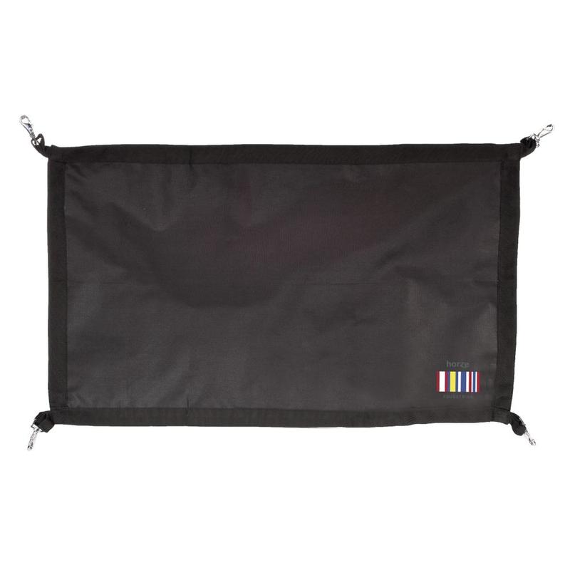 Zamknięcie boku firmy Horze. Wykonane z mocnego i trwałego materiału, który został zbrojony taśmą poliestrową. Blokada przydatna podczas zawodów, ponieważ blokuje wyjście, a zarazem zapewnia łatwy dostęp do konia. Wyposażona w cztery zapięcia na metalowe karabińczyki. Materiał : 100% poliester. Wymiary 100cm x 60cm.