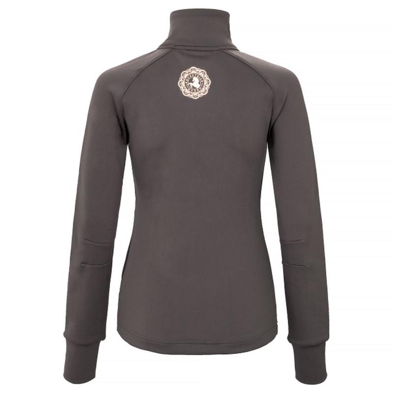 Bluza firmy Equestrian Queen. Wykonana z technicznego materiału, który jest elastyczny, oddychający i lekki. Bluza ozdobiona została suwakami i nadrukami w kolorze różowego złota. Posiada specjalne otwory w tkaninie dla lepszej wentylacji.