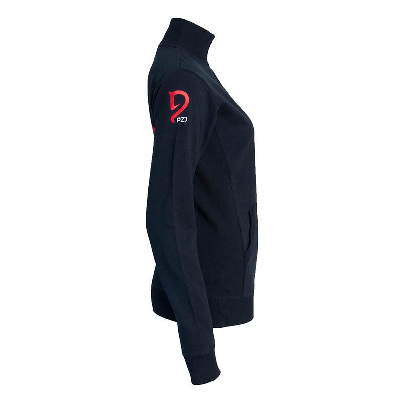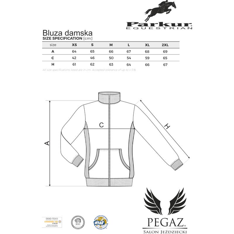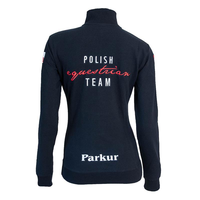 Bluza kadrowa męska Polish Equestrian Team firmy Parkur.Uszyta z elastycznego materiału ,który trwale utrzymuje swój kształt. Posiada taliowany krój podkreślający sylwetkę. Wyposażona w spiralny zamek błyskawiczny na całej długości Stójka i części boczne z dzianiny ściągaczowej z domieszką elastanu. Kieszenie naszyte typu kangurka.