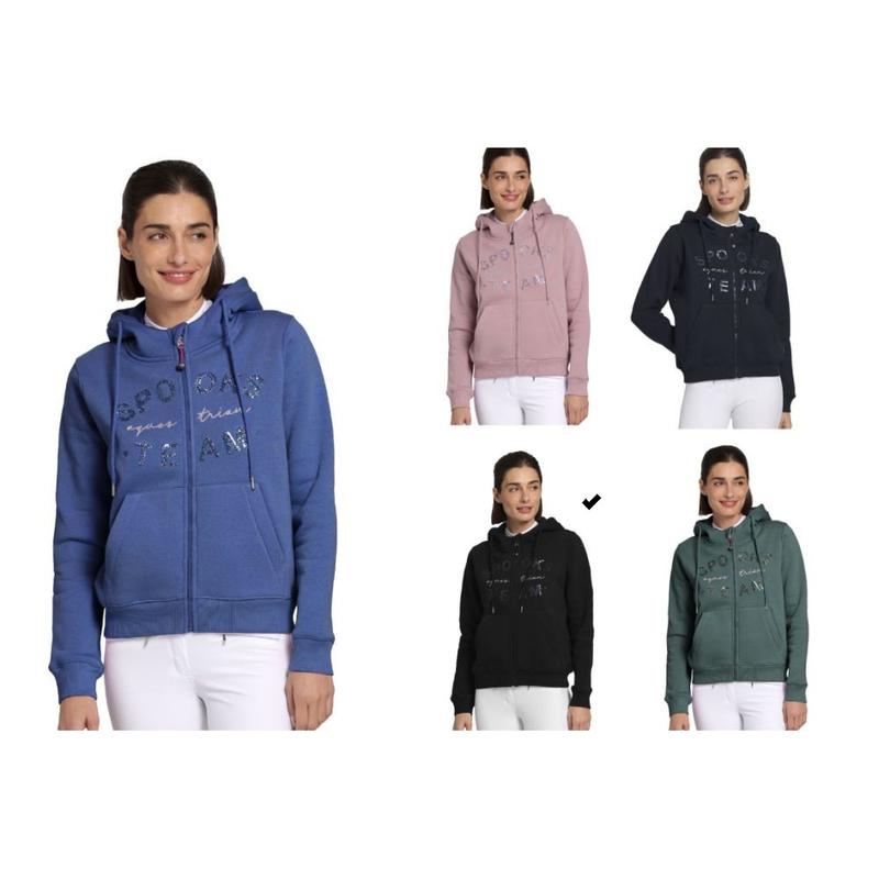 Bluza rozpinana damska firmy Spooks. Dopasowana bluza z kapturem ma dwie boczne kieszenie, które zapewniają wystarczająco dużo miejsca na najważniejsze drobiazgi. Nowoczesny design dopełnia połyskujący napis SPOOKS wykonany z cekinów i srebrny haft na piersi.