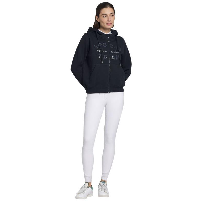 Bluza rozpinana damska firmy Spooks. Dopasowana bluza z kapturem ma dwie boczne kieszenie, które zapewniają wystarczająco dużo miejsca na najważniejsze drobiazgi. Nowoczesny design dopełnia połyskujący napis SPOOKS wykonany z cekinów i srebrny haft na piersi.