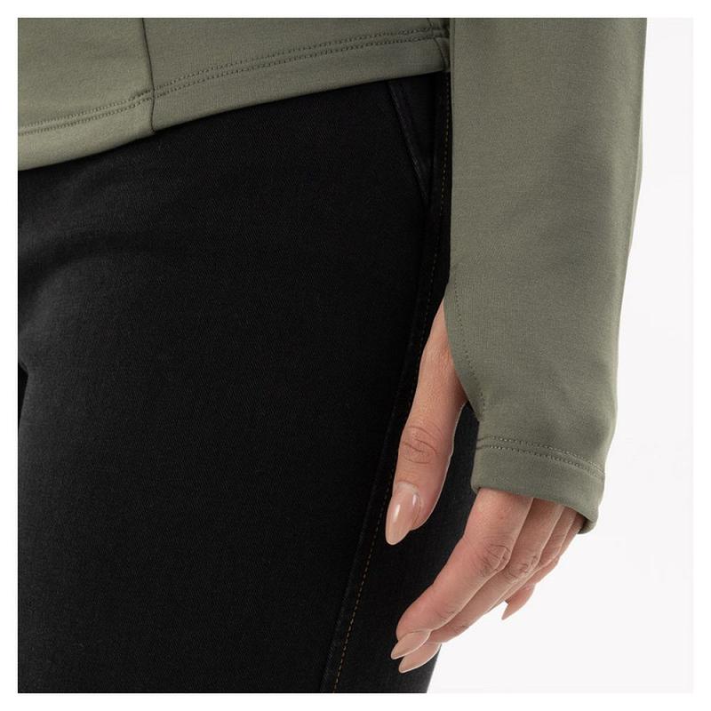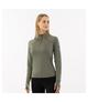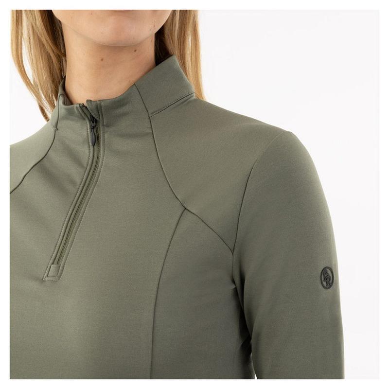 Bluzka damska firmy BR odprowadzająca wilgoć i regulująca temperaturę ciała. Posiada kołnierzyk zapinany na zamek. Ozdobiona adrukiem na rękawie. Posiada otwory na kciuki na końcach rękawów.