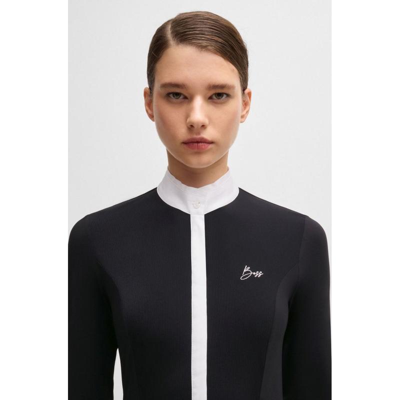 Bluzka konkursowa firmy Boss Equestrian z ukrytym zapięciem na guziki. Kołnierzyk, zapięcie na guziki i mankiety wykonane są z elastycznej bawełny. Nowy haft z logo BOSS zakrzywioną czcionką.