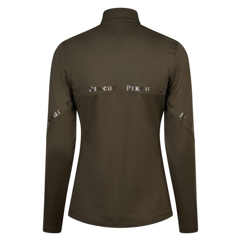Bluzka techniczna firmy QHP. Bluzka ma długie rękawy i jest wykonana z miękkiej, elastycznej tkaniny. Tekst „Equestrian sports” jest wytłoczony brokatem z tyłu bluzki. Wyposażona w krótki zamek z przodu. Bluzka z kolekcji jesień-zima.Skład tkaniny: 92