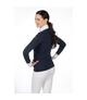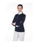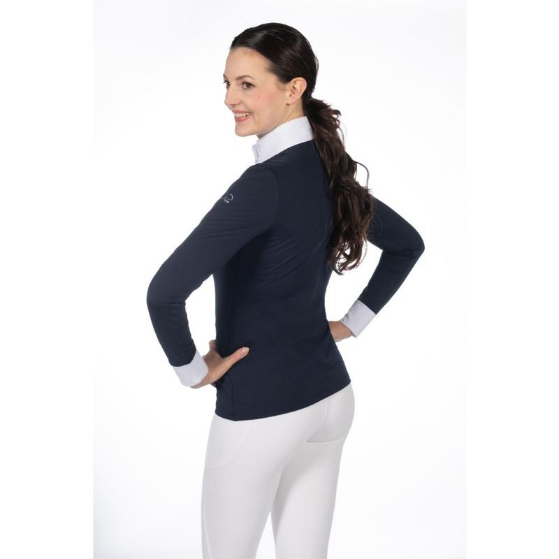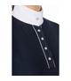 Bluzka konkursowa taliowana firmy HKM. Wykonana z elastycznego, oddychającego materiału. Posiada ozodbe zatrzaski o wyglądzie masy perłowej. Ozodbiona brokatową lamówką na plisie guzikowej.