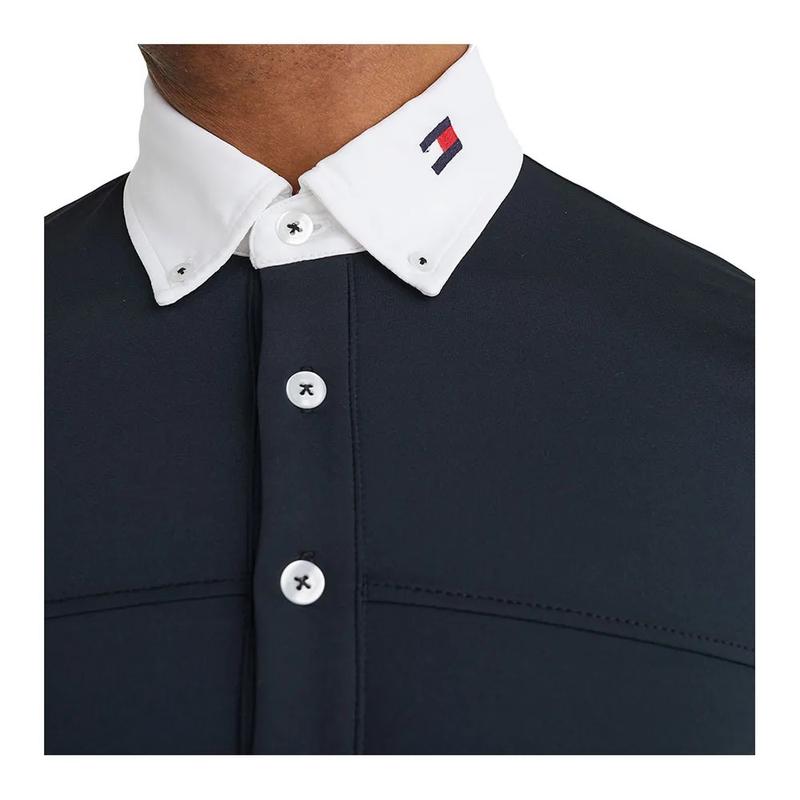 Koszulka konkursowa męska z firmy Tommy Hilfiger Equestrian. Ponadczasowa koszulka turniejowa z długim rękawem, zapięciem na guziki polo, przypinanym kołnierzykiem. Haftowane logo na lewej piersi. Rozmiar logo zgodny z wytycznymi FEI.