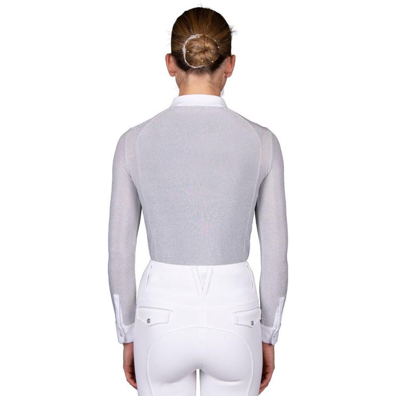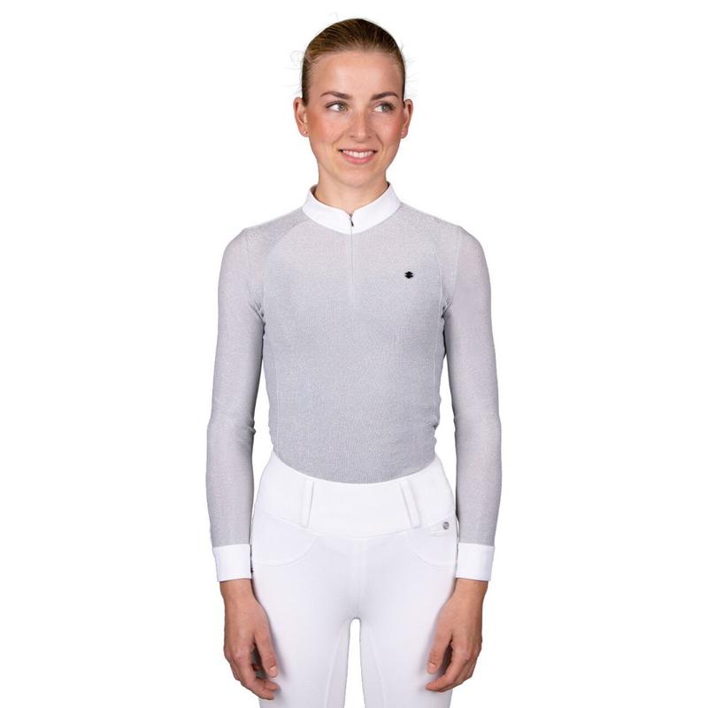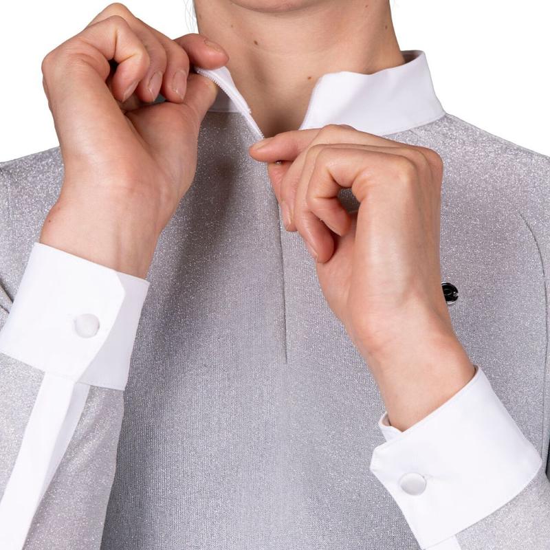 Bluzka konkursowa firmy QHP z długim rękawem. Wykonana z pięknej tkaniny brokatowej. Wyposażona w ukryty zamek błyskawiczny. Ozdobiona logiem producenta na lewej piersi.