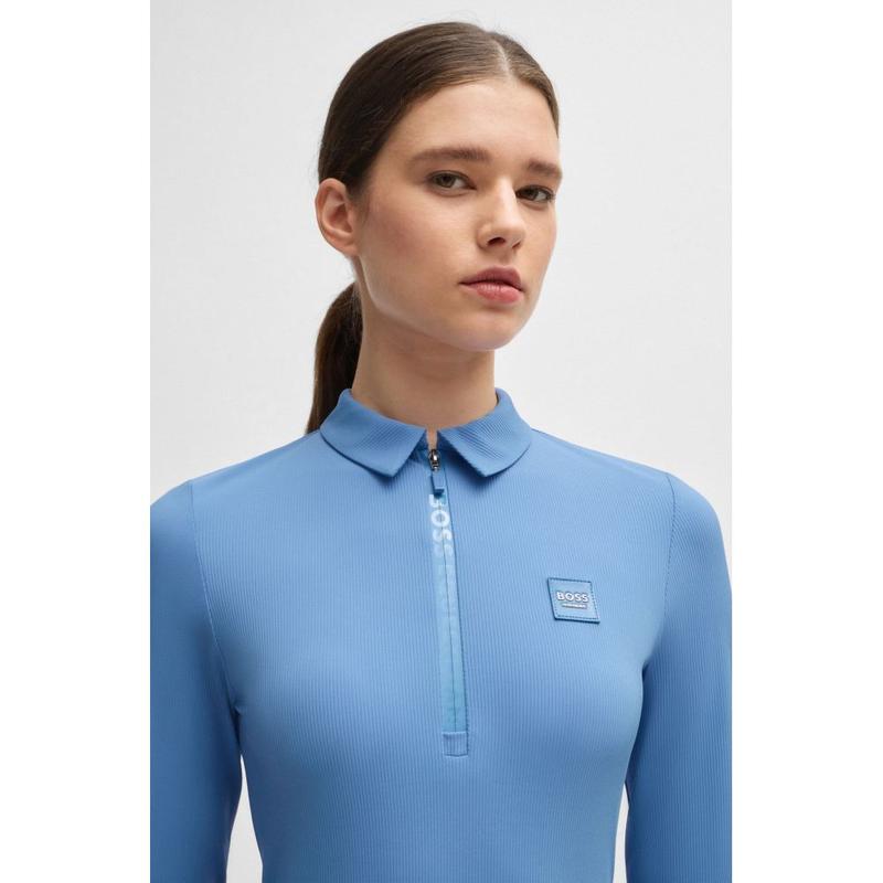 Funkcjonalna koszulka treningowa firmy Boss Equestrian. Zamek błyskawiczny o długości 25 cm w odcieniu logo BOSS Equestrian. Mały suwak, pasujący do koszulki, również z logo BOSS. Mała flaga z podpisem na prawym ramieniu. USP - oddychający - ochrona przed słońcem - rozciągliwy w 4 kierunkach - szybkoschnący - niemnący się - neutralny dla klimatu.
