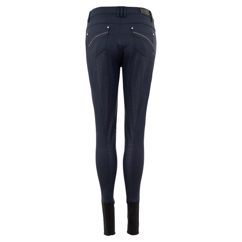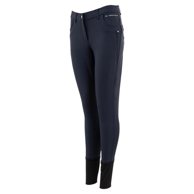 Bryczesy firmy BR z silikonowym lejem zimowa wersja tkaniny Soft Micro Touch (SMT). Tkanina jest wodoodporna, oddychająca i szybkoschnąca, dzięki czemu nadaje się na wiele warunków pogodowych. Zdobiony srebrną taśmą brokatową i srebrnym nadrukiem tekstowy