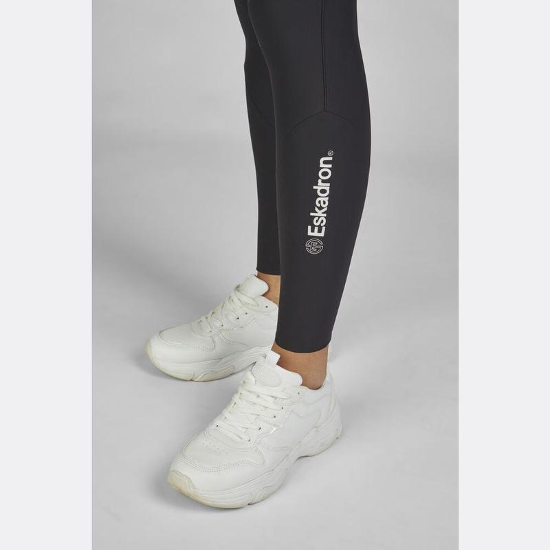 Techniczne legginsy jeździeckie Elmira. Legginsy te mają klasyczne, charakterystyczne udo z logo Tommy Hilfiger i są wyposażone w silikonowy uchwyt oraz poręczną kieszeń na telefon komórkowy na lewym udzie. Logo Tommy Hilfiger wewnątrz paska i na dole.