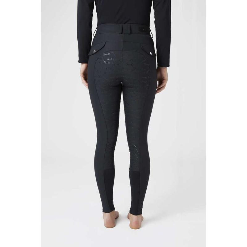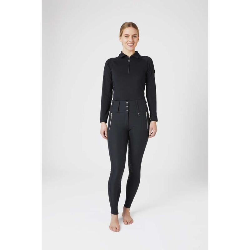 Bryczesy damskie firmy Horze. Bryczesy posiadają wysoki stan który pięknie modeluje sylwetkę. Posiadają starannie rozmieszczone szwy z przodu które, które optycznie wydłużają nogi. Dwie zapinane na zamek kieszenie przydadzą się, jeśli zechcesz mieć przy s