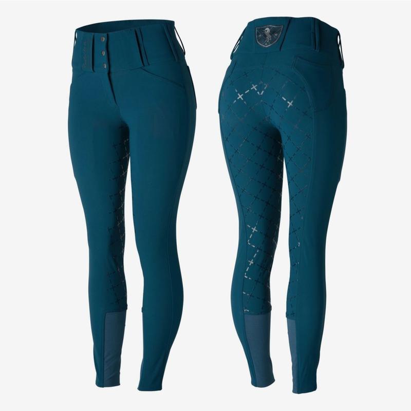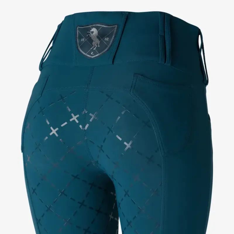 Damskie bryczesy firmy Horze z lejem silikonowym. Uszyte z funkcjonalnego materiału który jest chroniony przed promieniowaniem UV (UPF 50+) oraz dporny na wodę i brud. Nowa, gładsza wysoka talia. Brak szlufek na pasek. Elastyczne nogawki.