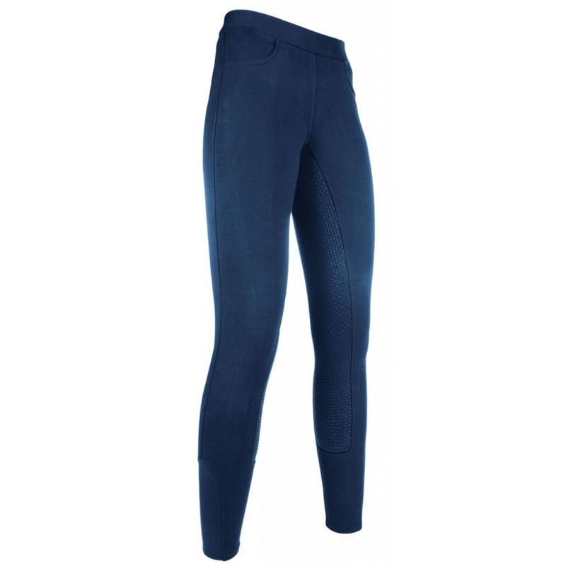 Leginsy jeździeckie z pełnym lejem silikonowym Yvi firmy HKM. Wykonane z oddychającego, elastycznego, miłego dla skóry materiału. Wyposażone w dwie przednie kieszenie oraz lej silikonowy gwarantujący dobrą przyczepność w siodle. Nogawki zakończone elastyc
