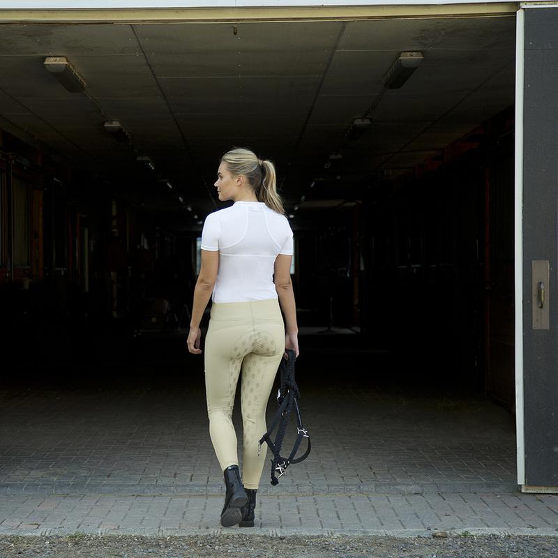 Bryczesy damskie Leah Horze firmy Horze. Dzięki wykonaniu z cienkiego materiału spodnie idealnie nadają się na lato. Bardzo elastyczny i dobrze dopasowując się do sylwetki materiał. Wyposażone w pełny lej silikonowy, dwie kieszenie z przodu zdobione kamie