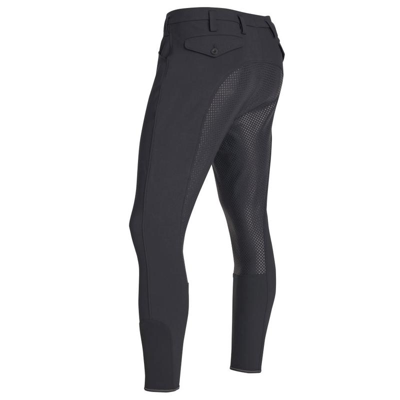 Te szare męskie bryczesy firmy QHP posiadają pełny antypoślizgowy lej. Z dwiema kieszeniami z przodu i kieszeniami na zamek z tyłu, wszystkie mają szaro-czarną lamówkę. Posiada również kieszonkę na monety z zamkiem błyskawicznym. Z elastycznie zakończonymi nogawkami. Skład: 58% bawełna, 34% nylon, 8% lycra.