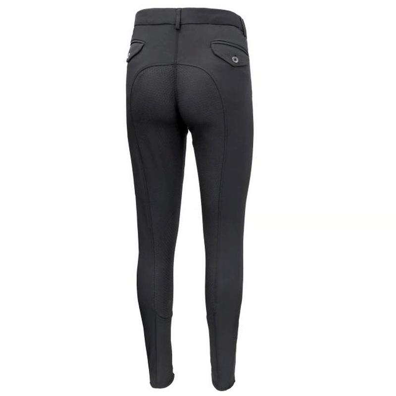 Bryczesy męskie wykonane z elastycznego materiału. Posiadają antypoślizgowy, silikonowy uchwyt, kieszenie z patkami z tyłu oraz elastyczne wstawki na nogawkach.