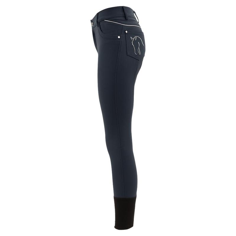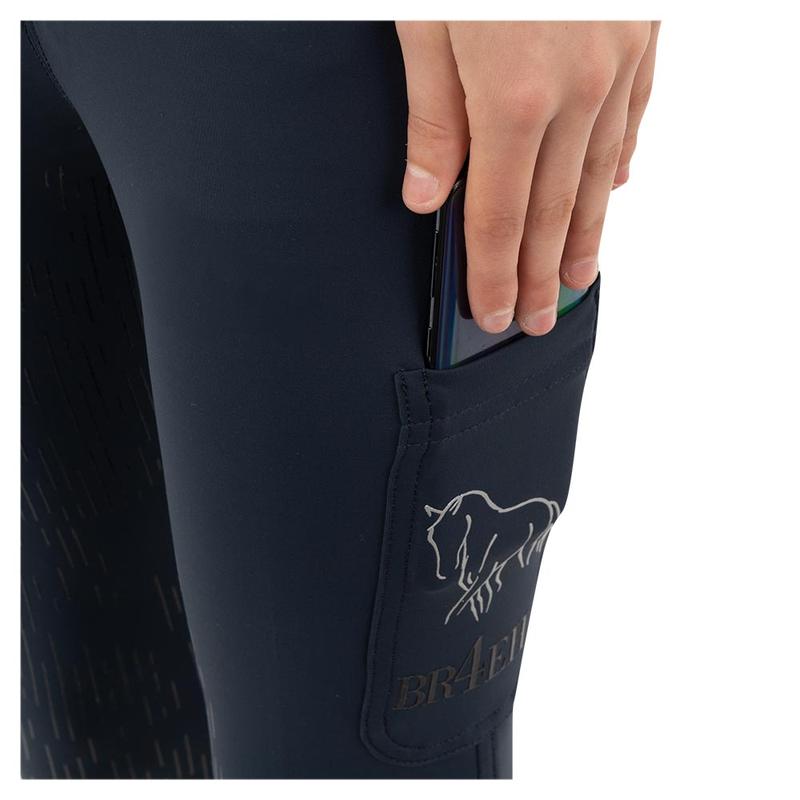 Bryczesy młodzieżowe firmy BR wykonane z miękkiej w dotyku tkaniny z kieszonką na telefon z nadrukiem konia. Materiał: CST: 78% poliamid, 22% elastan.