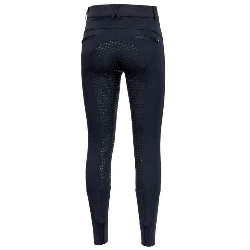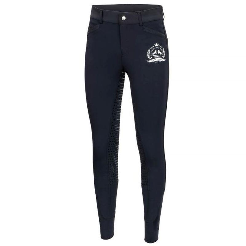 Bryczesy młodzieżowe z pełnym silikonowym lejem, ozdobione kontrastowym przeszyciem i kolorowym nadrukiem. Z tyłu dwie kieszenie zapinane na zamek.