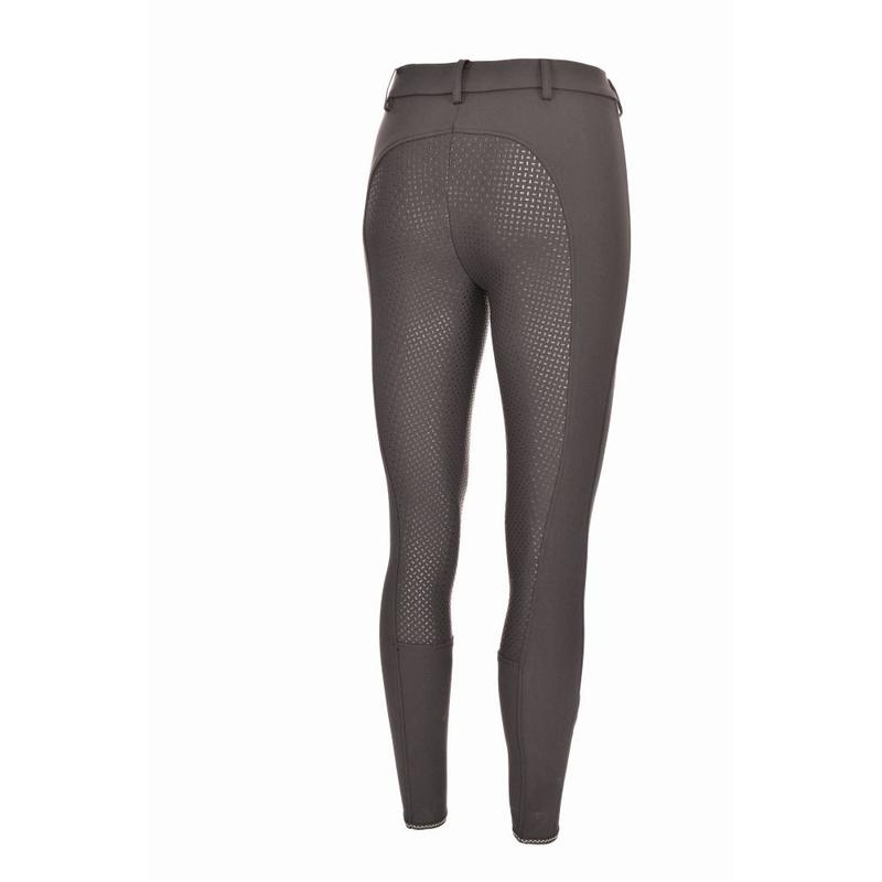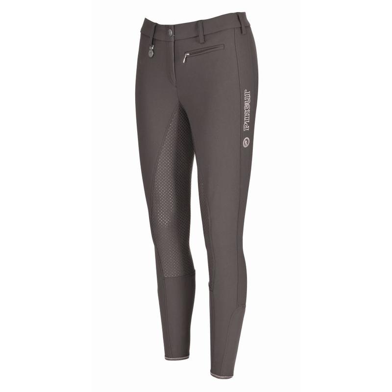 Damskie bryczesy Lucinda Grip firmy Pikeur. Wykonane z tkaniny tekstylnej, bardzo elastycznej, oddychającej i przyjaznej dla skóry. Lej pokryty silikonem, dzięki któremu bryczesy bardzo dobrze trzymają się w siodle. Wyposażone w zapinaną na suwak kieszeń.