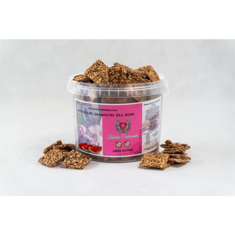 Smakołyki Końska Cukierenka to naturalne smakołyki dla koni. Smakołyki są wykonane w 100% z naturalnych, oczyszczonych produktów i nie zawierają sztucznych aromatów, barwników ani konserwantów. Skład: 50 – 70% świeże arbuzy i jabłka, płatki owsiane, otręby pszenne, siemię lniane, olej sojowy, mąka kukurydziana.