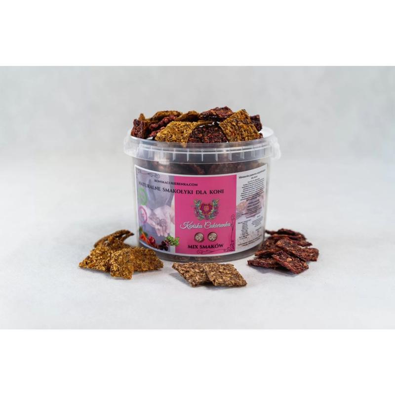 Smakołyki Końska Cukierenka to naturalne smakołyki dla koni. Smakołyki są wykonane w 100% z naturalnych, oczyszczonych produktów i nie zawierają sztucznych aromatów, barwników ani konserwantów.Opakowanie zawiera mieszankę wszystkich dostępnych smaków. Skład: 50 – 70% świeże jabłka/marchew/ burak czerwony/ banany/ mango/ malina owoce i liście/ dynia/ gruszka/ czarna porzeczka, płatki owsiane, otręby pszenne, siemię lniane, olej sojowy, mąka kukurydziana, cynamon/mięta/sezam/wiórki kokosowe/ dzika róża/ aronia/ziarna słonecznika/ pestki dyni