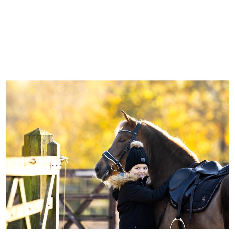 Opaska firmy Schockemoehle. Posiada błyszczący nadruk i kryształki. Wyposażona w wewnętrzną wyściółkę z miękkiego pluszowego polaru, modna opaska na głowę może być noszona nawet pod czapką jeździecką szczególnie w zimne dni. Również stylowe aplikacje z kryształkami dodają odrobiny blasku.