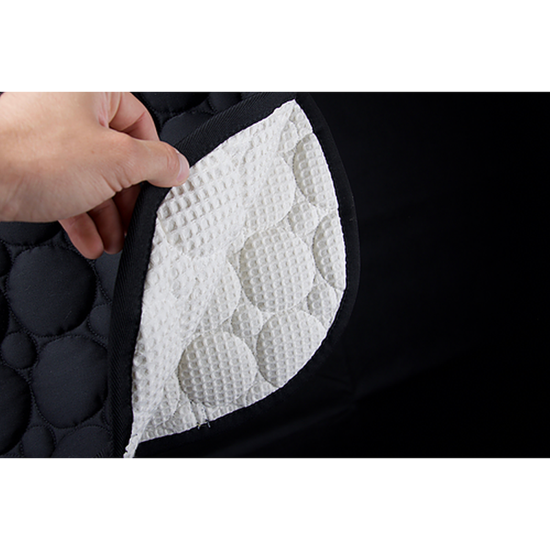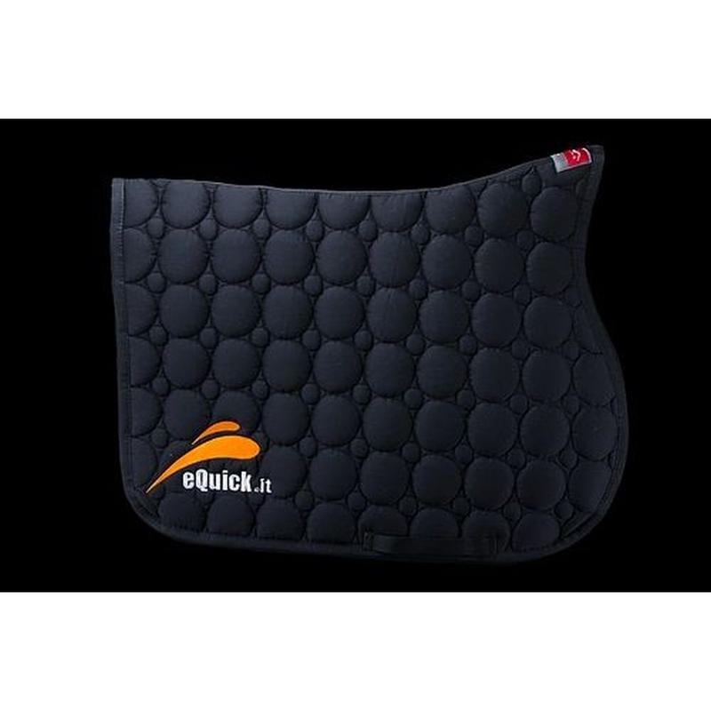 Czaprak firmy eQuick. Wykonany z wysokiej jakości materiałów: wierch z trwałego poliesteru, spód podszyty przyjazną dla konia bawełną. Czaprak posiada anatomiczną linię grzbietu, który zapewnia kofort wykłębionym koniom. Idealnie odprowadza wilgoć na zewnątrz. Oryginalnie pikowany.