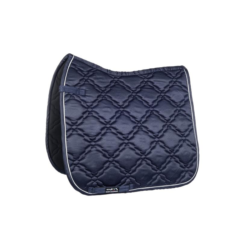 Czaprak Bologna firmy HKM. Pikowany w duże czworokąty. Wykonany z materiału wchłaniającego pot, jako wypełnienie zastosowano piankę poliestrową. Bardzo szybko dopasowuje się do kształtu końskiego grzbietu. Posiada paski do przystuł zapinane na rzepy. Obsz