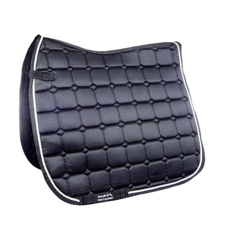 Czaprak Madrid firmy HKM. Wykonany z bardzo dobrej jakości materiału. Pikowany w oryginalny wzór, posiada wypełnienie z pianki i waty. Wchłania wilgoć i pot. Dzięki swojemu krojowi idealnie dopasowuje się do grzbietu konia. Posiada paski do przystuł zapin