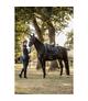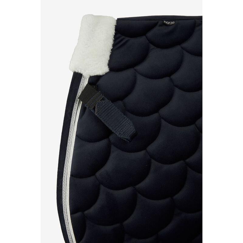 Czaprak firmy Horze. Wykonany z miękkiego aksamitnego materiału i wykończony od środka praktyczną, szybkoschnącą podszewką. Ozdobione sztucznym futerkiem, pikowaniem i podwójną sznurkową lamówką. Ochronna wstawka zapobiega obtarciom. Posiada logo producenta w dolnym rogu i na kłębie.