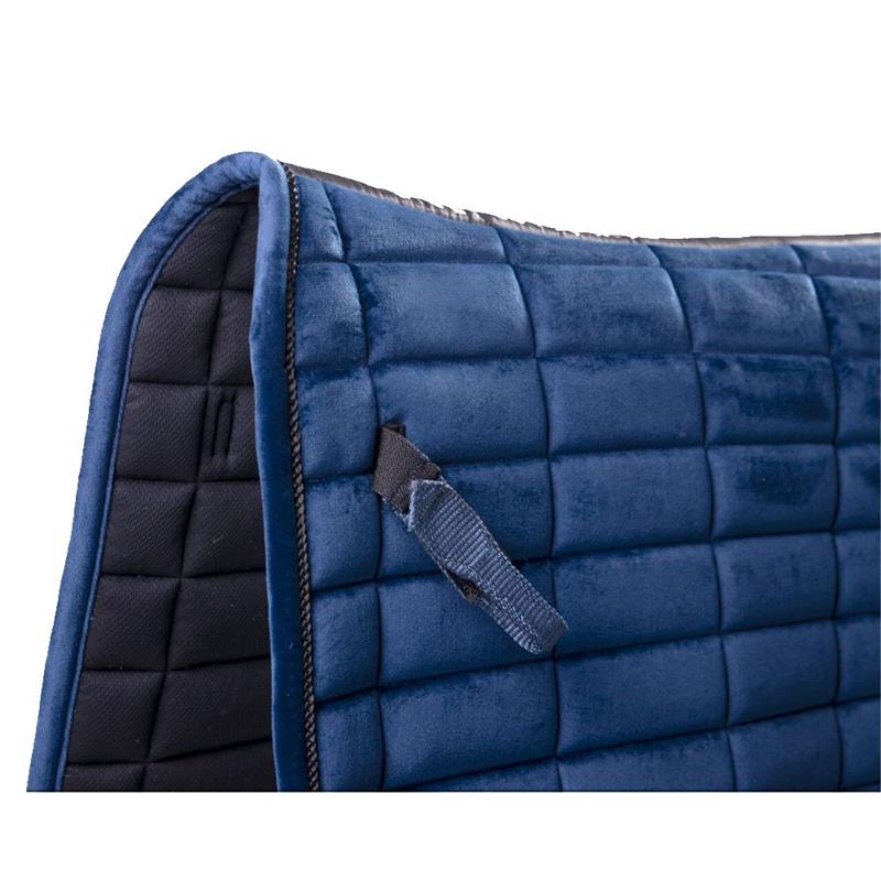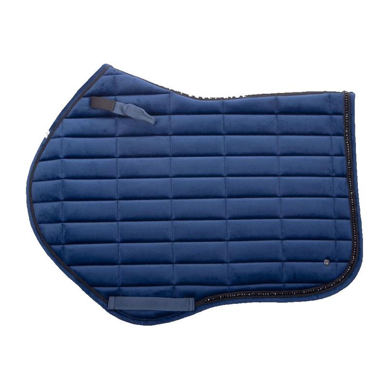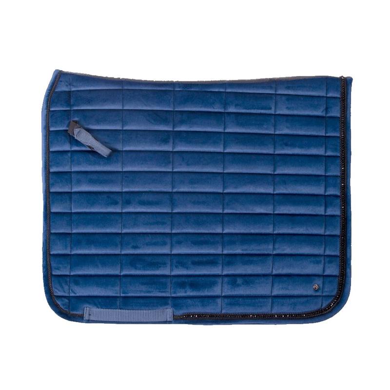 Czaprak Astana firmy QHP to elegancki aksamitny czaprak z prostokątnym wzorem szwów. Ozdobiony koralikami i dwoma ozdobnymi sznurkami. Wyposażony w krótkie, elastyczne pętle na siodło z zapięciem na rzep oraz pętle na popręg. Wyposażony w chłonną podszewkę z siateczki.