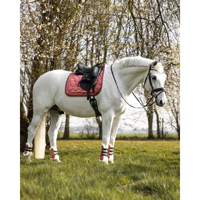 Elegancki czaprak firmy QHP z ozdobnym sznurkiem. Wyposażony w futerko z przodu od wewnętzrnej strony, który zapobiega ślizganiu się i zapewnia większy komfort.