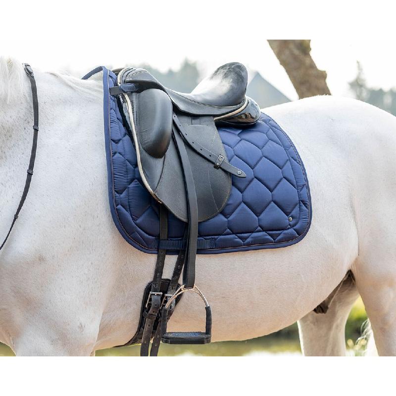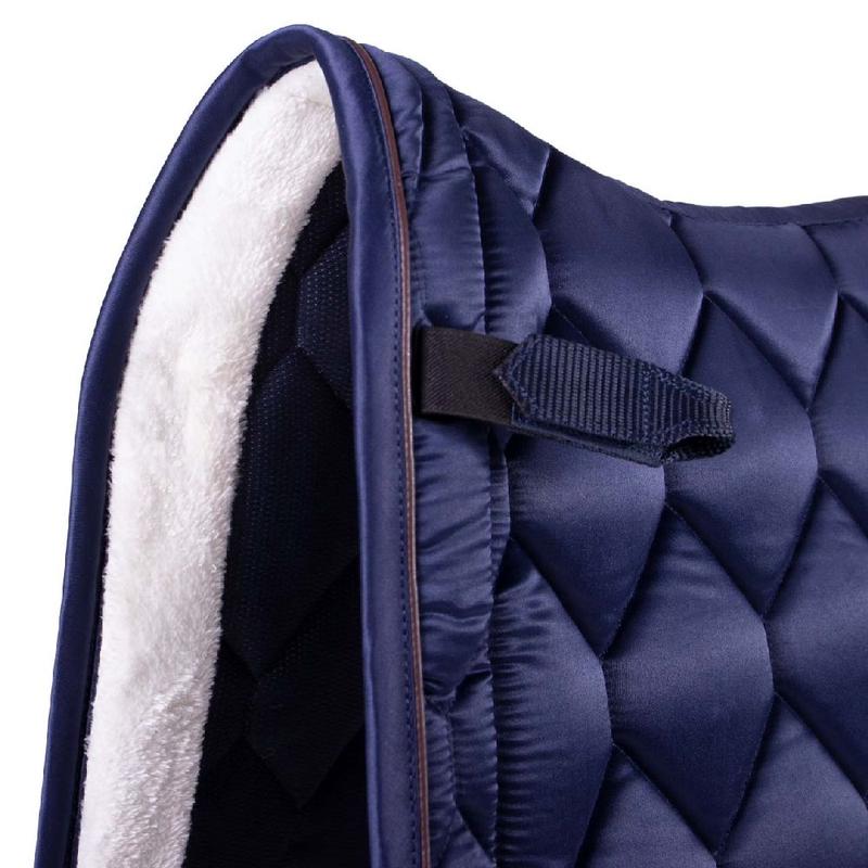 Elegancki czaprak firmy QHP z ozdobnym sznurkiem. Wyposażony w futerko z przodu od wewnętzrnej strony, który zapobiega ślizganiu się i zapewnia większy komfort.
