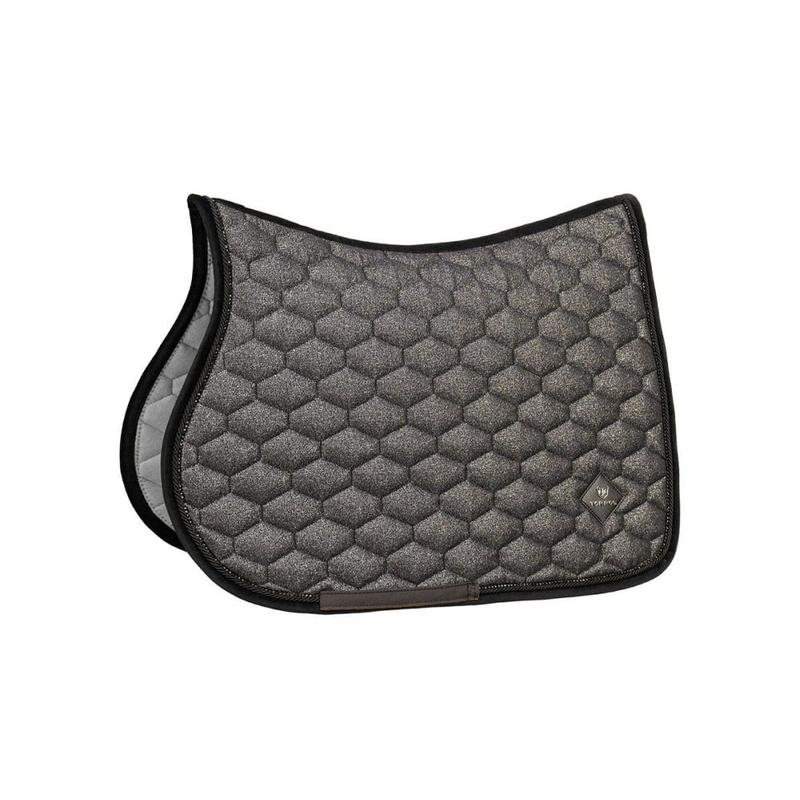 Czaprak firmy Eskadron z kolekcji Heritage 2025/2026. Wykonany z błyszczącego zewnętrznego materiału. Duże pikowanie o średnio grubym wypełnieniu. Wyposażony w silikonowe panele w miejscu siodła w celu jego lepszej stabilizacji. Lamówka ozdobiona blyszczącym sznurkiem oraz kryształkami. Materiał: 85% bawełny, 15% elastanu.