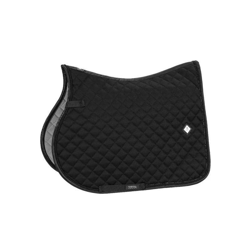 Czaprak firmy Torpol. Dopasowany do anatomicznych kształtów konia. Wykonany z drobno pikowanego drelichu, odpornego na przetarcia i utratę koloru. Posiada bezkonkurencyjne właściwości termoregulacyjne. Wewnętrzna część z materiału Evolon® powoduje, że czaprak chłonie pot, jest oddychający i osuszający. Nie zatrzymuje sierści – pozostaje na wierzchu, co ułatwia utrzymanie czapraka w czystości. Wykończony lamówką, ozdobiony sznurem w kolorze produktu i połyskującymi kryształkami.
