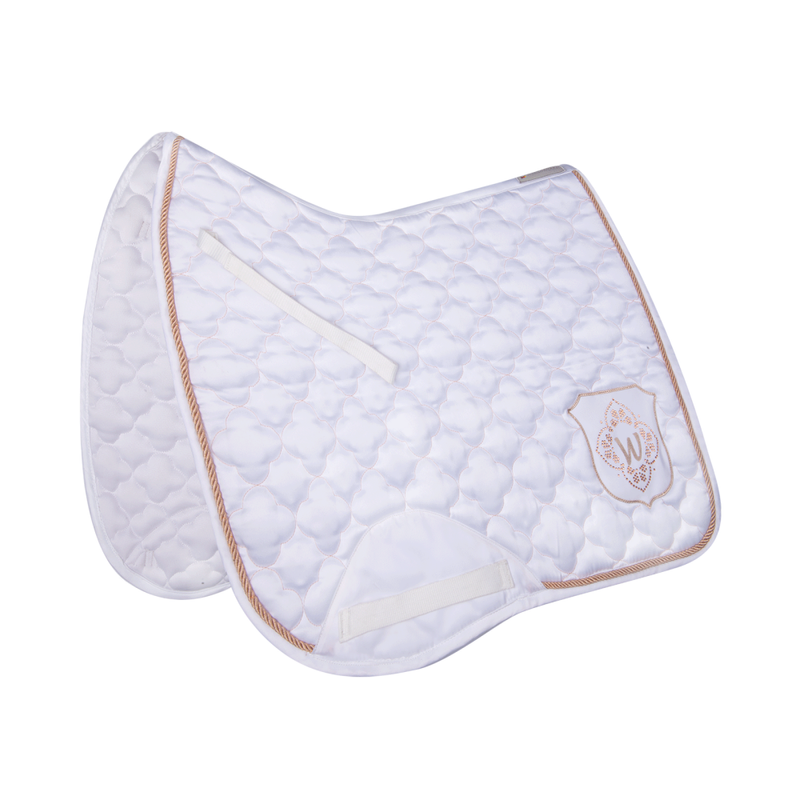 Czaprak firmy Eskadron z kolekcji Heritage 2025/2026. Wykonany z matowego zewnętrznego materiału. Duże pikowanie o średnio grubym wypełnieniu. Wyposażony w silikonowe panele w miejscu siodła w celu jego lepszej stabilizacji. Lamówka ozdobiona blyszczącym sznurkiem oraz kryształkami. Materiał: 100% poliester.
