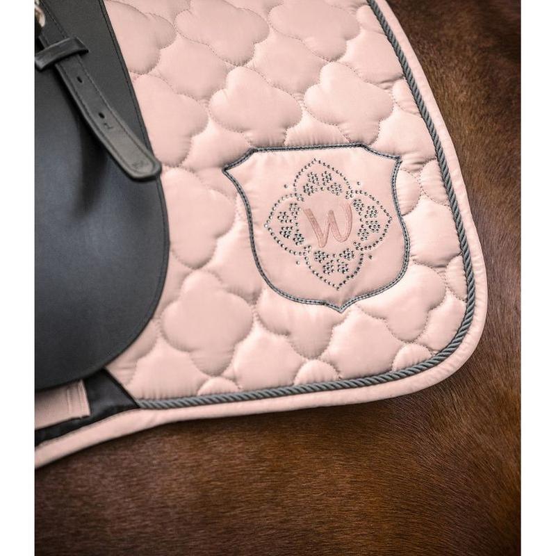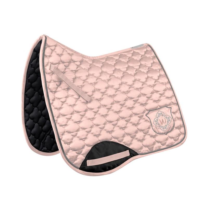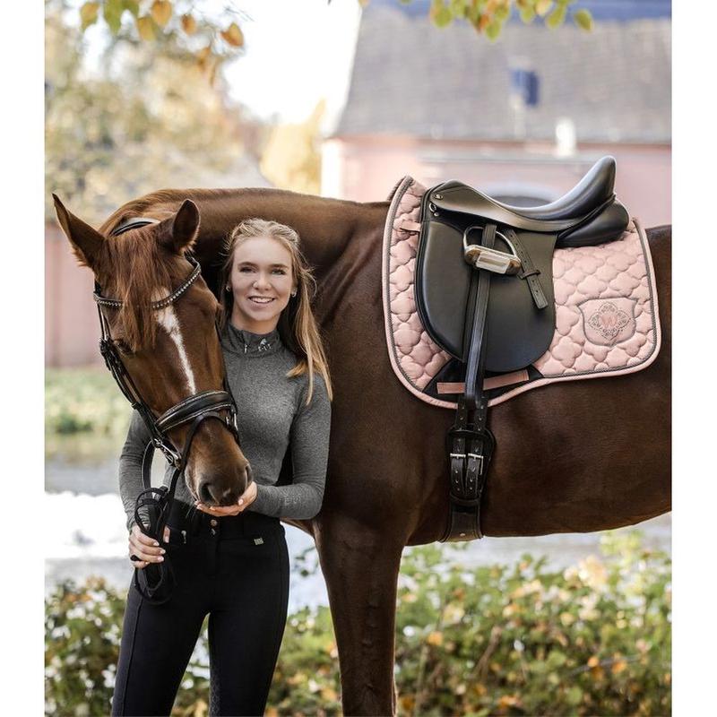 Elegancki, wysokiej jakości czaprak z kwiatowym pikowaniem w kształcie jedwabiu. Aplikacja z cyrkoniami sprawia, że ​​czaprak naprawdę przyciąga wzrok. Funkcjonalny spód zapewnia optymalną oddychalność. Pianka 10 mm i wypełnienie 200 g/m² zapewniają najlepszy rozkład nacisku.