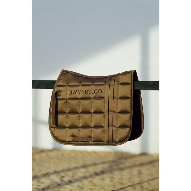 Czaprak firmy Eskadron z kolekcji Heritage 2025/2026. Wykonany z matowego zewnętrznego materiału. Duże pikowanie o średnio grubym wypełnieniu. Wyposażony w silikonowe panele w miejscu siodła w celu jego lepszej stabilizacji. Lamówka ozdobiona blyszczącym sznurkiem oraz kryształkami. Materiał: 100% poliester.