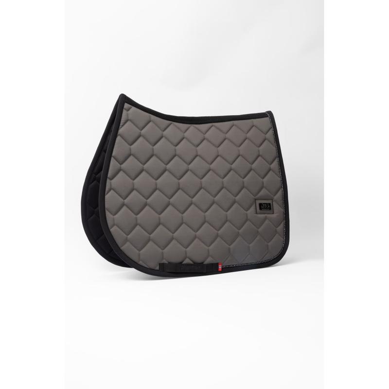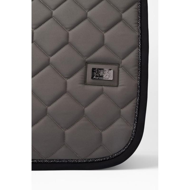 Czaprak firmy Eskadron z kolekcji Heritage 2025/2026. Wykonany z połyskującego materiału. Duże pikowanie o średnio grubym wypełnieniu. Wyposażony w silikonowe panele w miejscu siodła w celu jego lepszej stabilizacji. Lamówka ozdobiona blyszczącym sznurkiem oraz kryształkami. Materiał: 100% poliester.