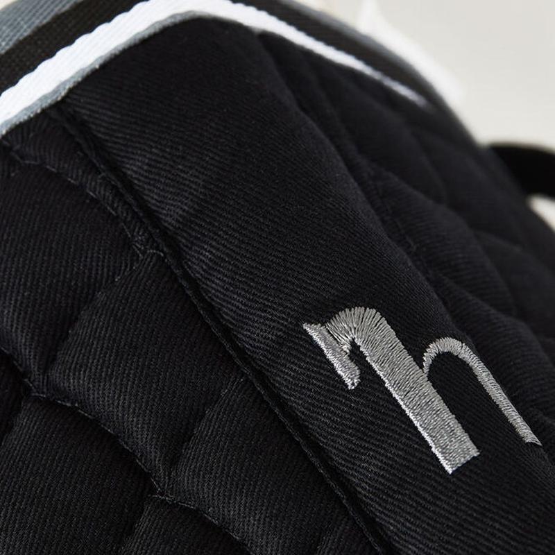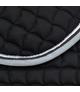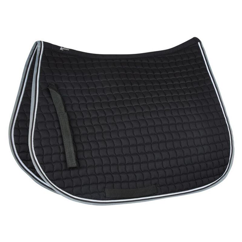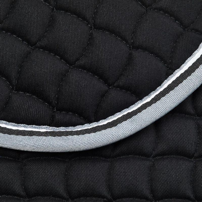 Czaprak firmy Horze. Uszyty z miękkiej bawełny. Ozdobiony i wykończony miękką, parcianą, dwukolorową lamówką. Posiada kwadratowe pikowani, miękkie wypełnienie i paski na rzepy do przymocowania czapraka do przystuł. Ozdobiona logo Horze wyhaftowanym na kłębie.