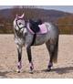 Czaprak firmy Horze. Uszyty z miękkiej bawełny. Ozdobiony i wykończony miękką, parcianą, dwukolorową lamówką. Posiada kwadratowe pikowani, miękkie wypełnienie i paski na rzepy do przymocowania czapraka do przystuł. Ozdobiona logo Horze wyhaftowanym na kłębie.
