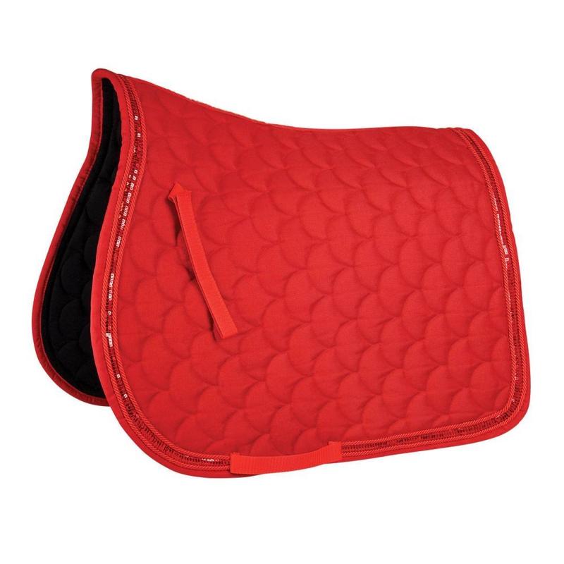 Czaprak o anatomicznym kształcie, podszycie wykonane z materiału typu Coolmax dla większej przewiewności i lepszego wchłaniania wilgoci, lamówka wykonana z cekinów nadaje szykownego i interesującego wyglądu.