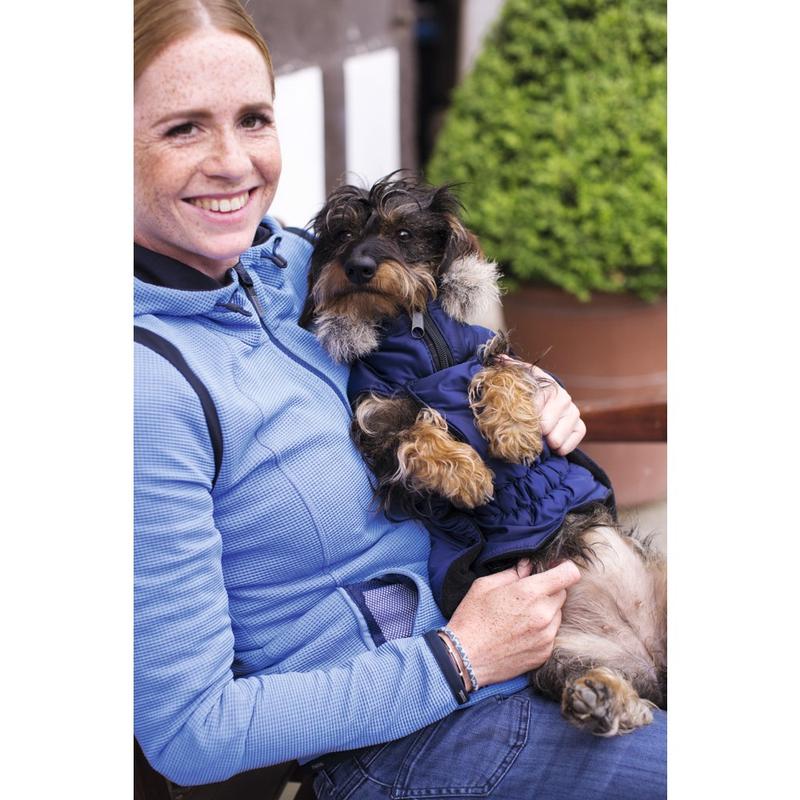 Derka dla psa firmy QHP. Wykonana z wysokiej jakości materiałów. Wyposażona w ozdobny sznurek. Od środka podszyta futerkiem, dzięki czemu zapewia dodatkowe ciepło. Dodatkowe elastyczne pasy na nogi i klapa na brzuch powodują, że derka nie przesuwa się.