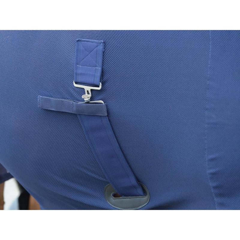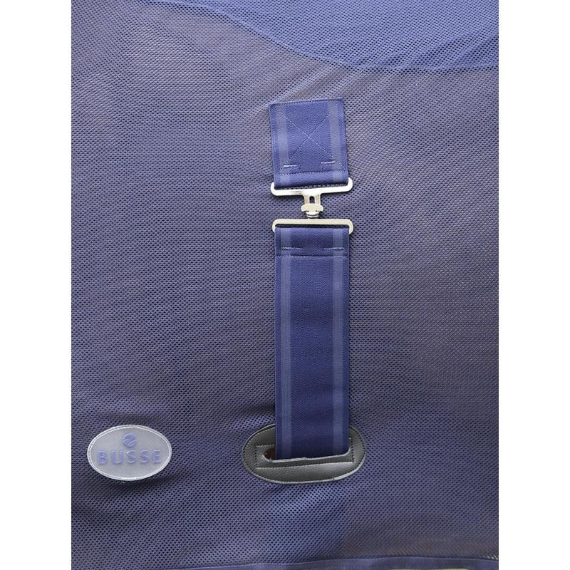Derka firmy Busse, wykonana z siatki poliestrowej bardzo odporna na zabrudzenia i wilgoć. Optymalne dopasowanie dzięki zastosowaniu szwu na grzbiecie, regulowane zapięcie pod brzuchem w formie pasów krzyżowych, z przodu zapinana na klamrę z dodatkowym zapięciem na rzep.